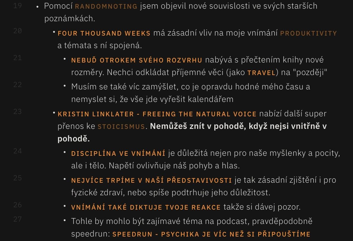 Ačkoliv pro svoji "stoickou" praxi mám separátní, papírový deník, velmi rád zaznamenávám pracovní poznámky a tvořím si "síť" záznamů, kterou můžu zpětně procházet. V praxi je to velmi jednoduché: